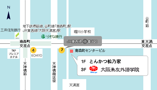 ・地下鉄谷町線・堺筋線「南森町」駅下車 7番出口徒歩1分 ・JR東西線「大阪天満宮」駅下車 7番出口徒歩1分 ・国道1号線、南森町交差点 東へ約100m |